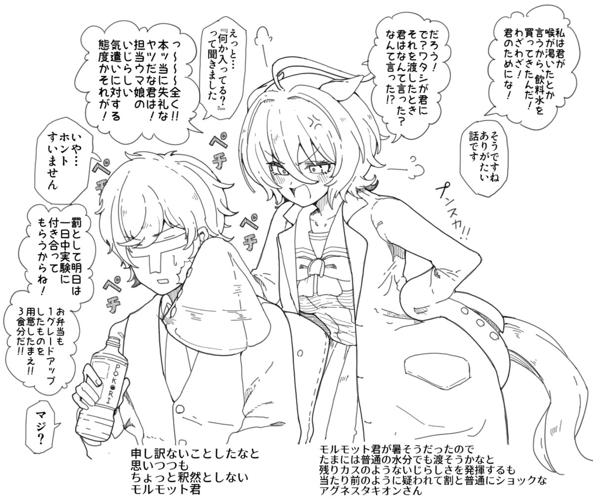 このときのことがあるから次に物をもらったときには「ありがとうタキオン」って素直に受け取ったら体が光りだして「あーっはっはっは!いやいや礼には及ばないさ、何も言わずに飲んでくれる以上の礼など存在しないからねぇ、この間と違って」って笑い転げる奴だよタキオンは