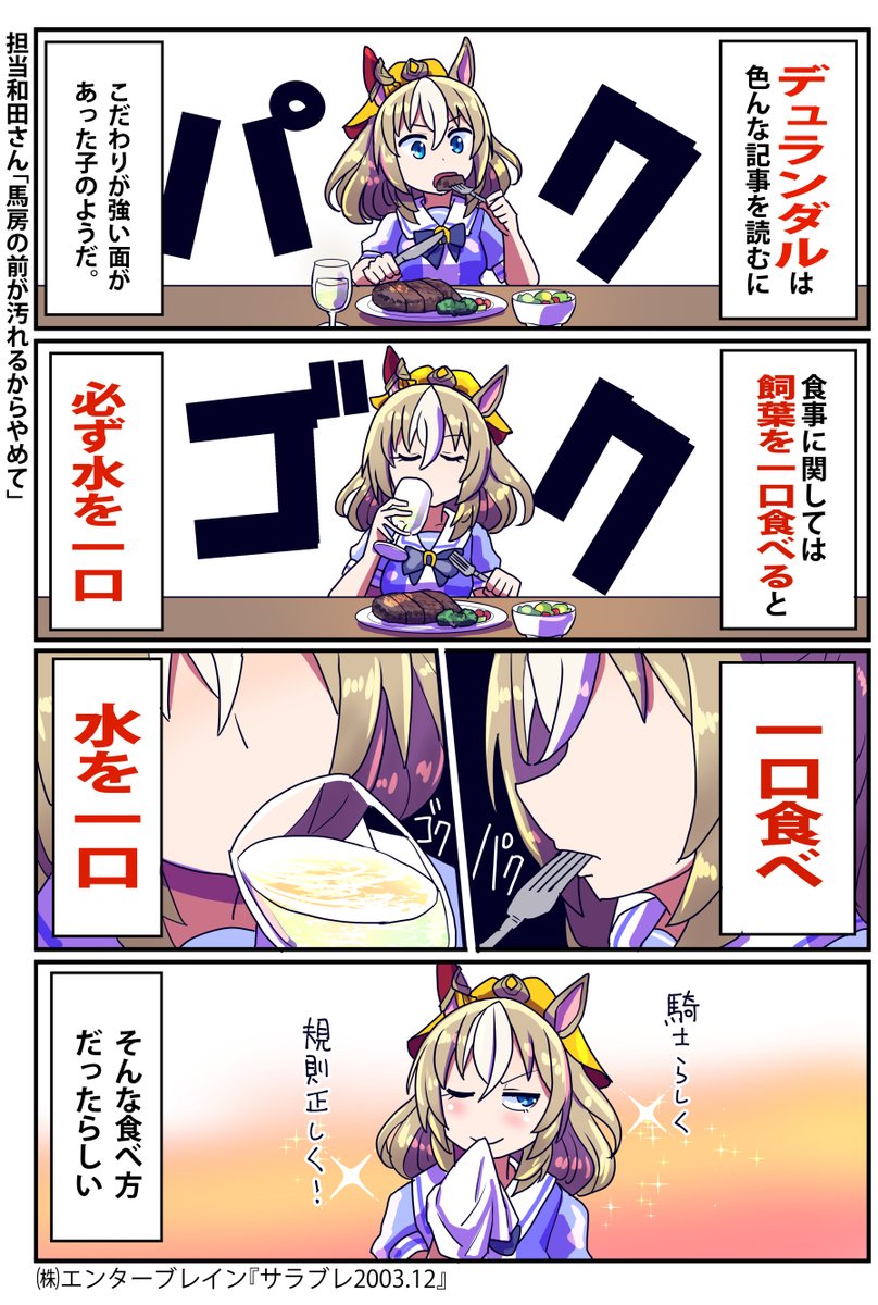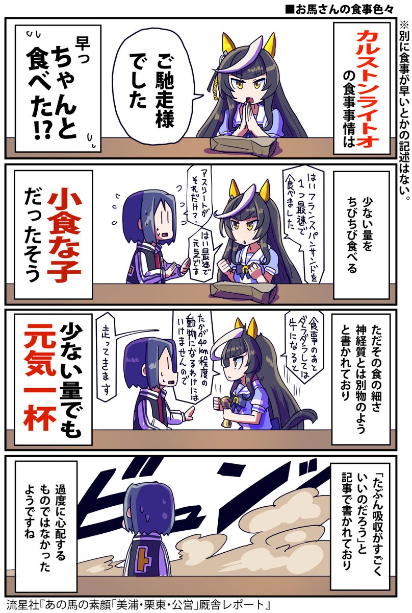 トランセンドの仕草をみて、トランもオグリみたいにたくさん食べるんだなぁって言ったトレーナーが居たけど、流石にファルコトレーナー過ぎると思ったわ