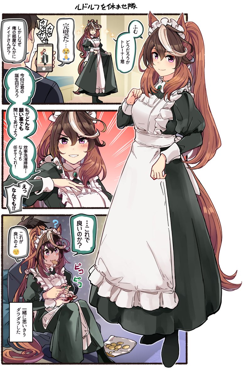 ルドルフがトレーナー君を実家に招待してちょっとした余興でメイドに扮して応対したところ全く気付かれる素振りがないのでそのまま応対を続け関係を深める内に自分に会いに来ているのかメイドに会いに来ているのか分からなくなって徐々に不安に駆られていくという夢を見たいの