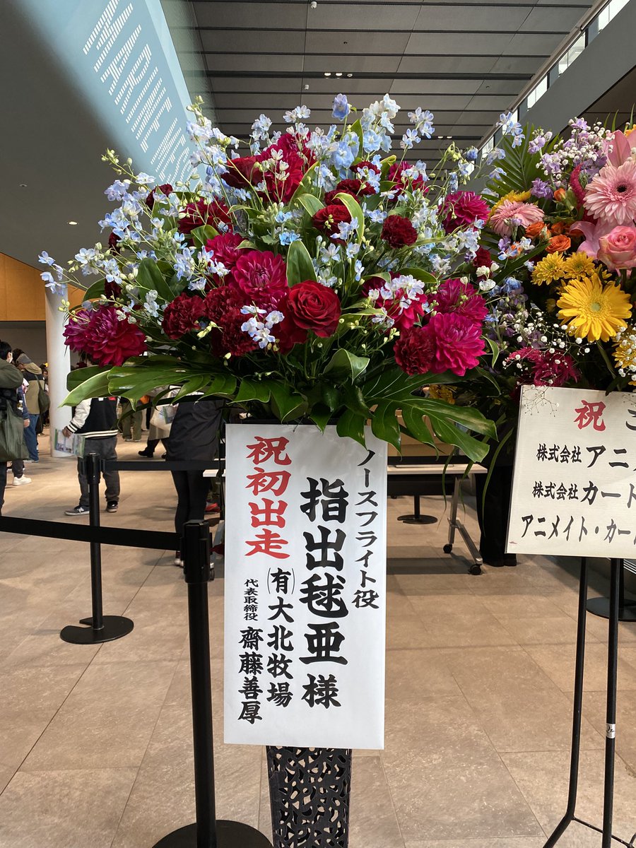 フーちゃんの勝負服に合わせた赤い花がとても綺麗で良いフラスタですね