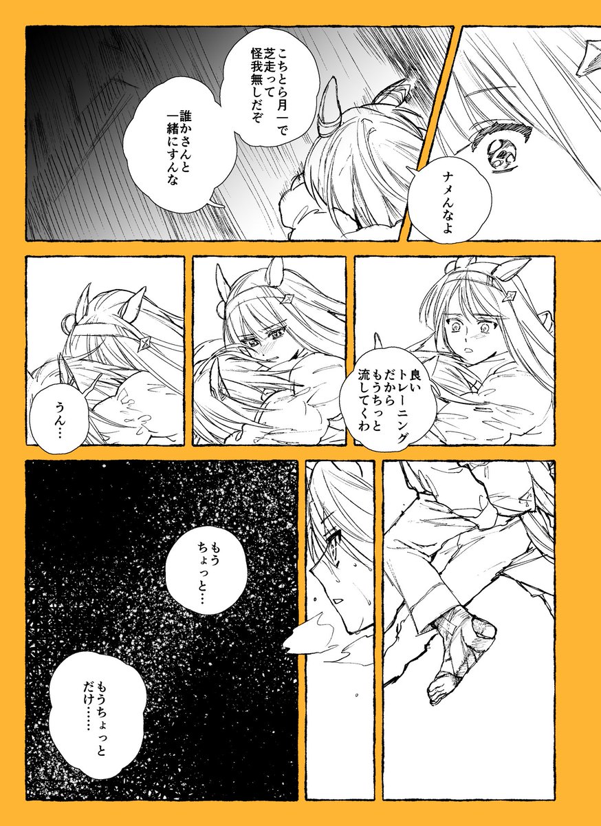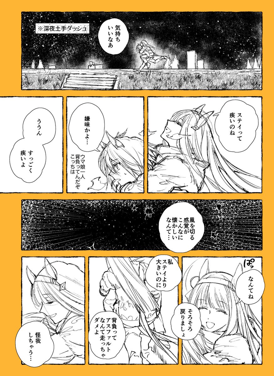 「走りながら眺める星空が好きだったけど、しばらくはお預けね…」としんみり言うスズカにッダァーーー‼️もう‼️ つって門限も過ぎてるのに一緒に病院抜け出してスズカをおぶりながら夜道を走るリョテイさん 言葉は無く、白い息と背中の温もりだけがある冬の日