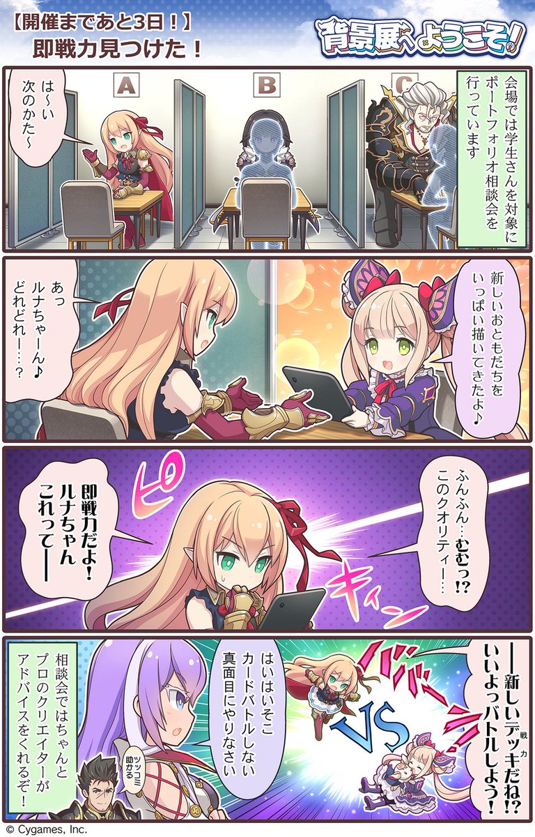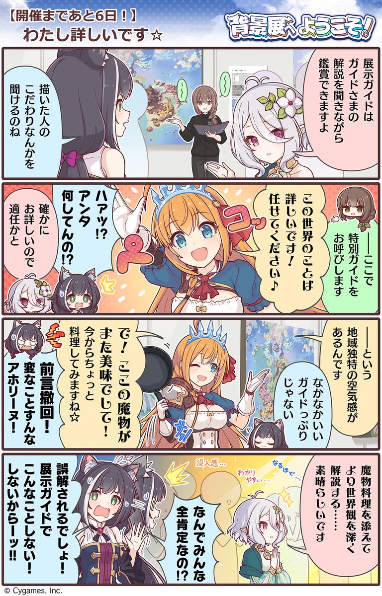 サイゲームスのキャラクターたちが本展を楽しむ様子を、4コマ漫画で毎日お届けします!