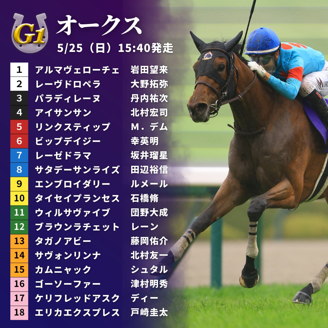 【#オークス】枠順が決定!👏 昨年の2歳女王アルマヴェローチェは1枠1番、桜花賞の勝ち馬エンブロイダリーは5枠9番、同レース3着のリンクスティップは3枠5番となりました。