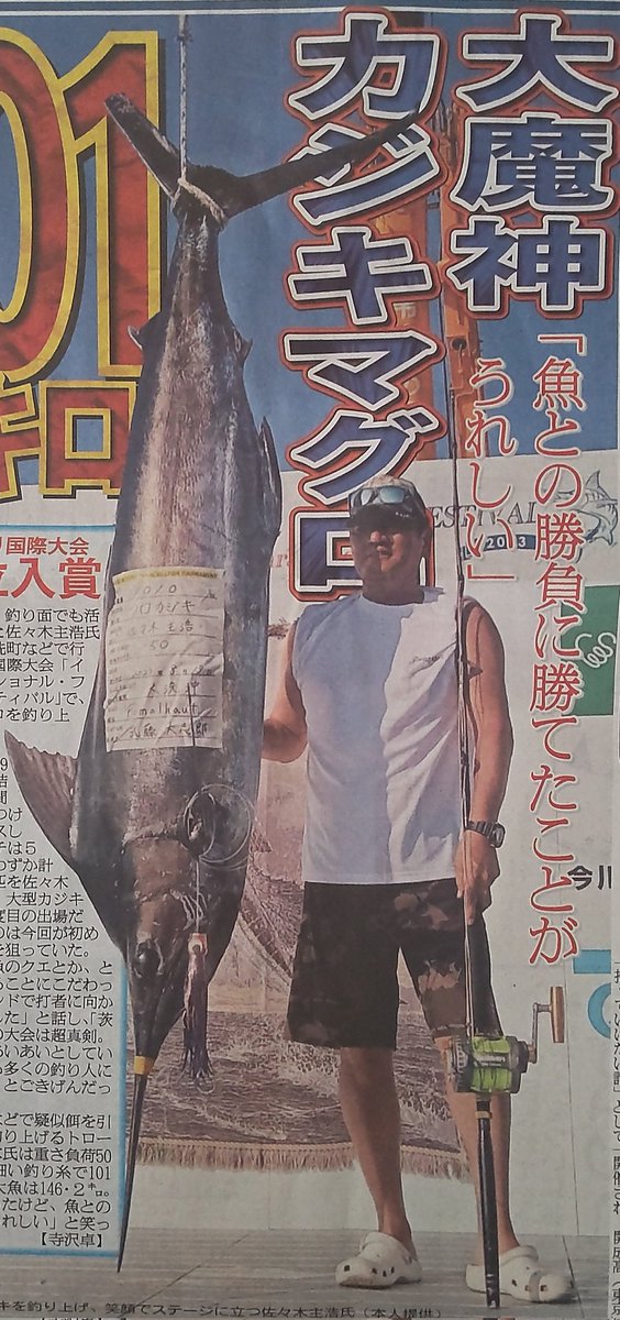 本日の社会面🎣日刊スポーツ野球評論家“大魔神”こと佐々木主浩さんがカジキ釣り国際大会で101㌔のカジキマグロを釣り上げ、4位入賞🎊詳しくはニッカンで📰