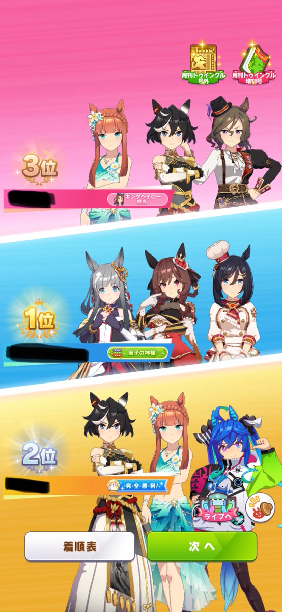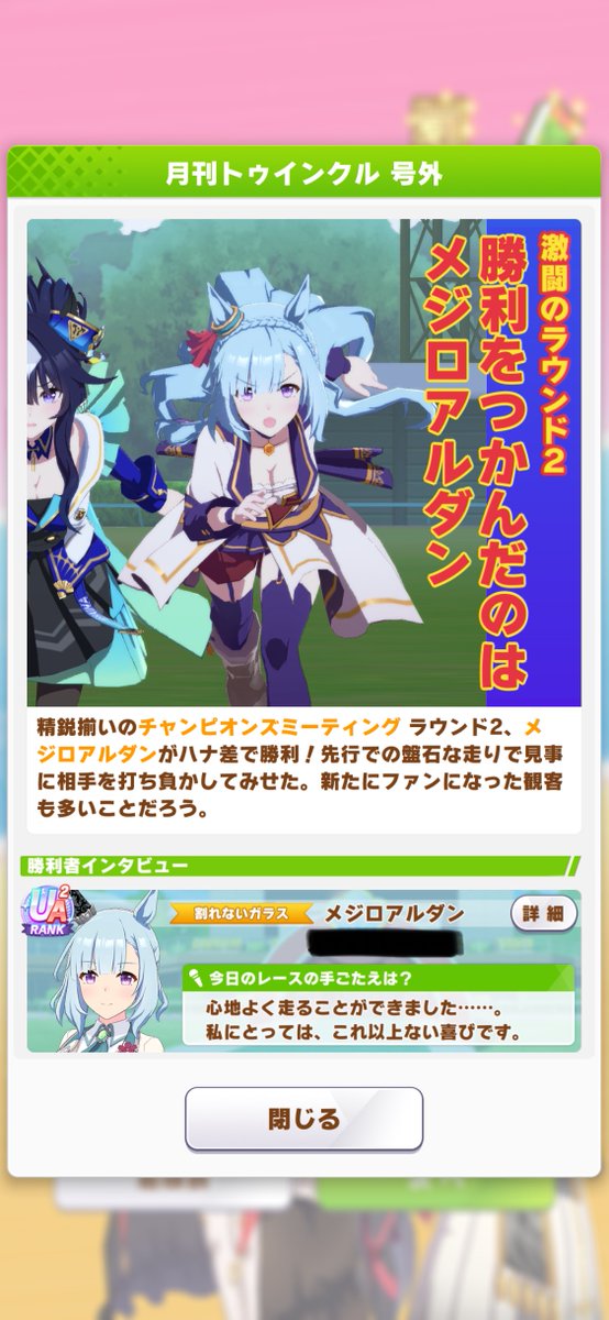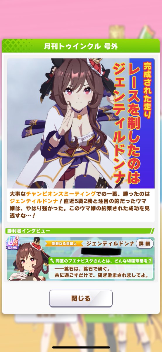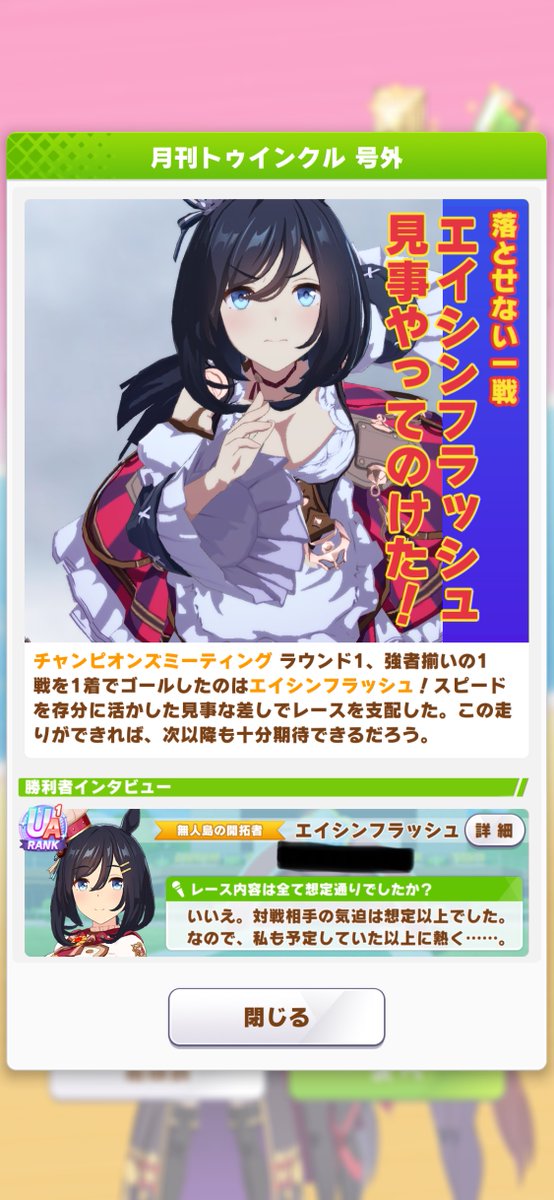 今月の号外。衣装チェンジした理由は、対戦相手が同じキャラを出してきた時に自分と相手のウマを区別しやすくする為。他の理由は全く何も一切無い。ヘイト企業■イゲは謝罪しろ!