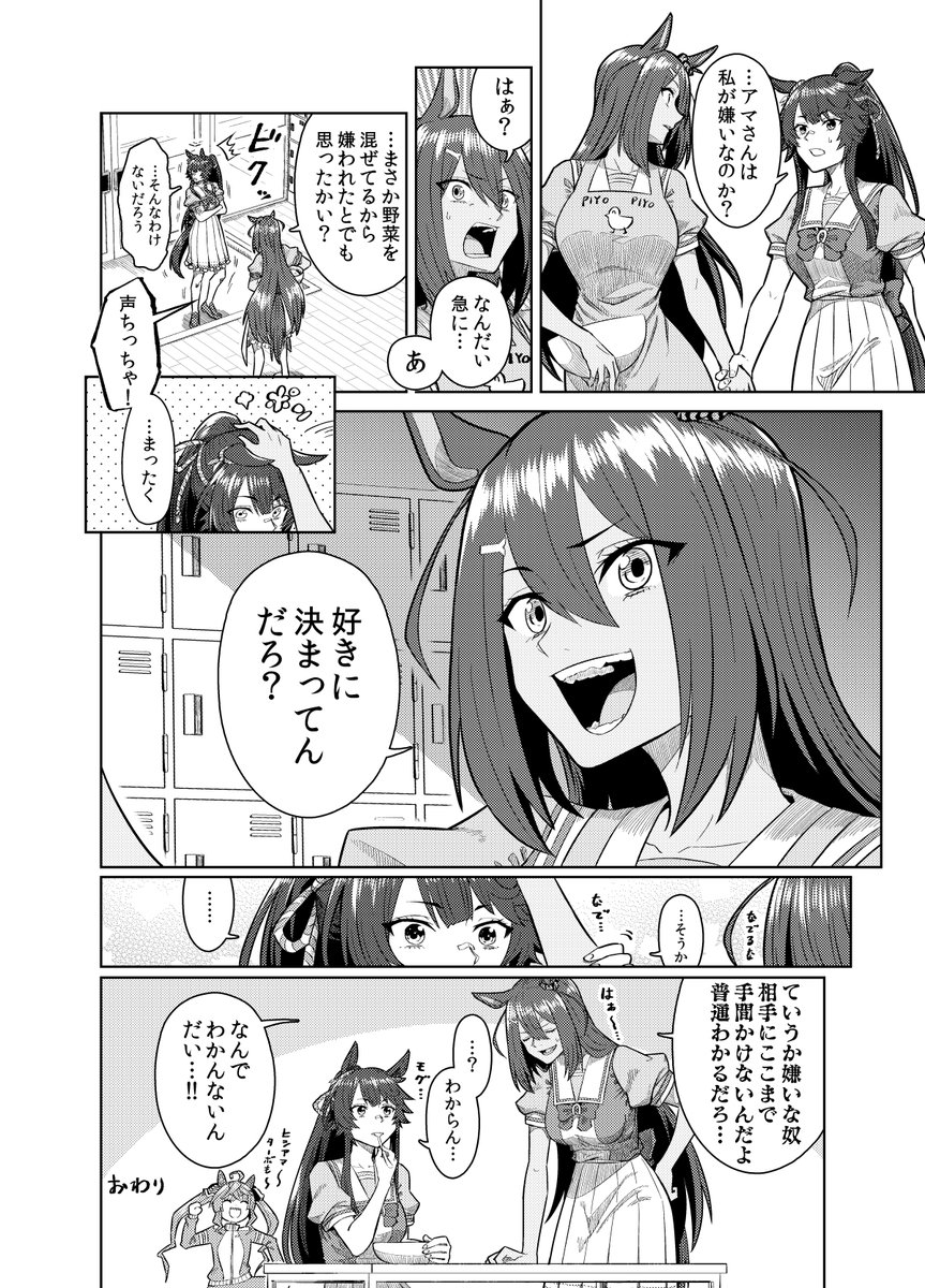「黒コゲのお肉と黒コゲのピーマンを食べて、黒コゲのお肉のほうを当ててください。当たれば一流ウマ娘ですよ~」