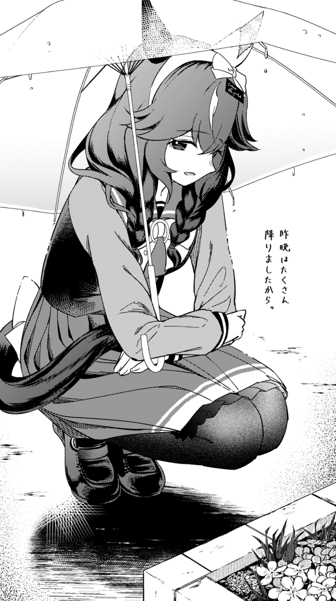 ウマ娘がしゃがみ込む時、地面が濡れている場合は尻尾が濡れないように前に抱え込む