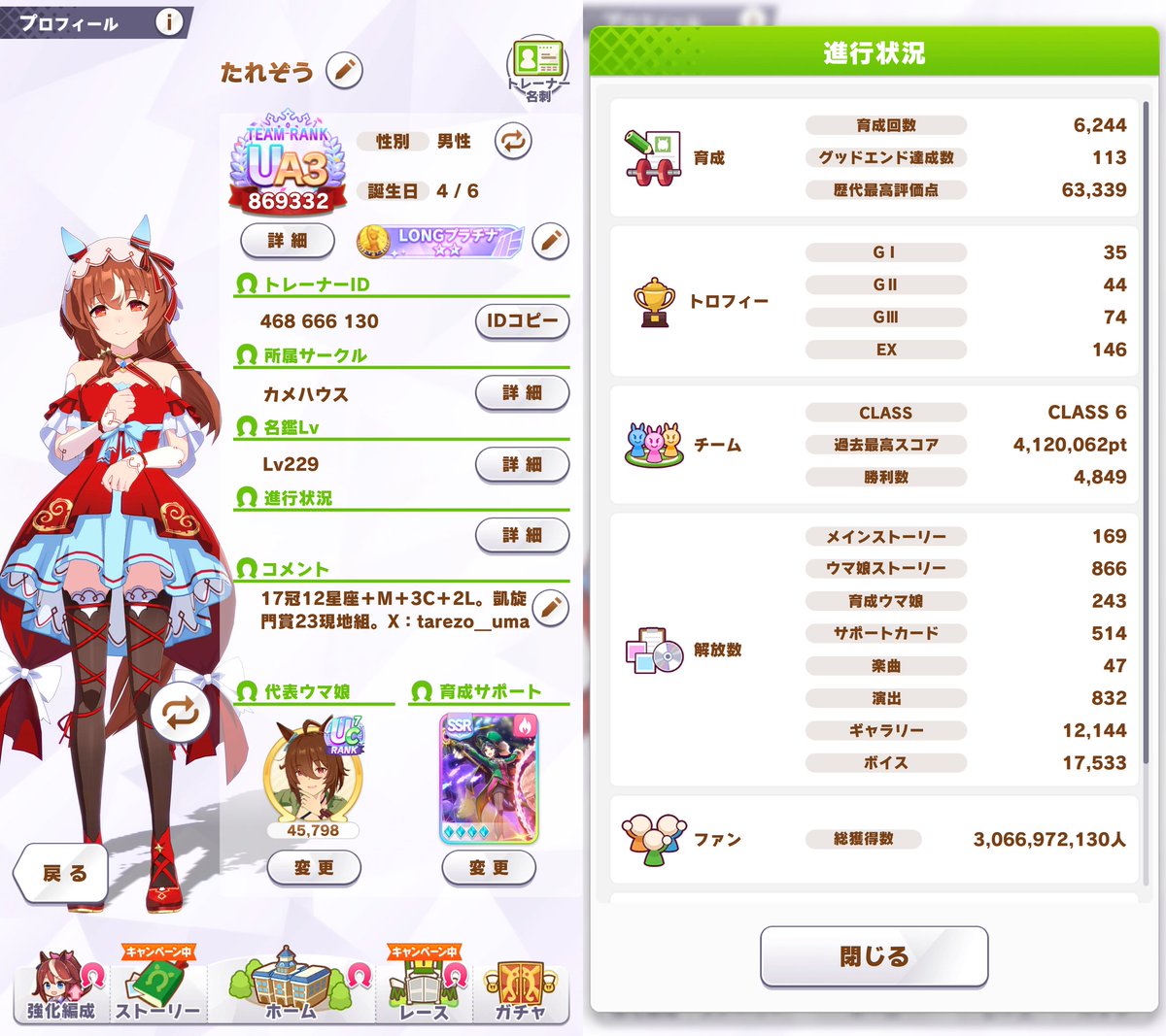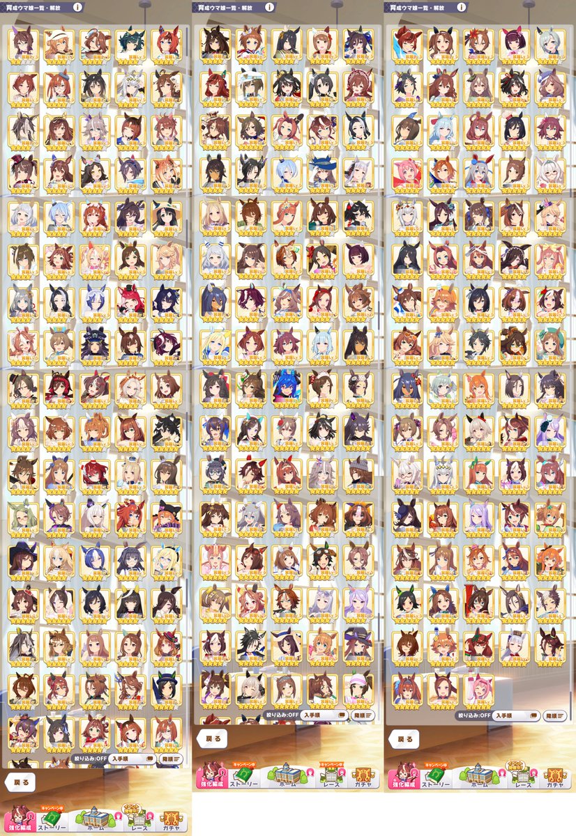 育成ウマ娘243(+44)、全キャラ覚醒5。