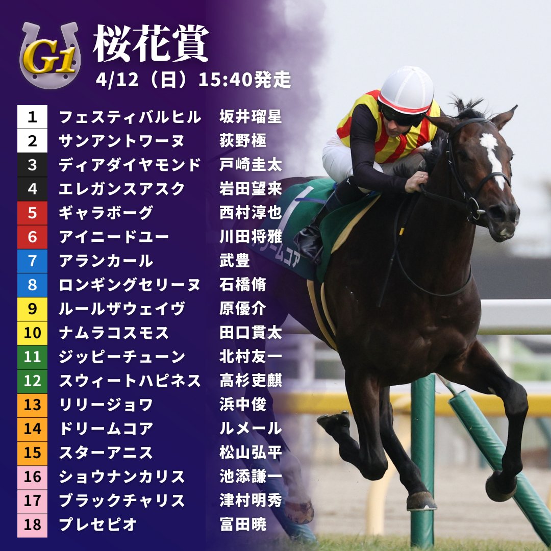【#桜花賞】枠順が決定!👏 クイーンCを快勝したドリームコアは7枠14番、昨年の最優秀2歳牝馬スターアニスは7枠15番、チューリップ賞3着のアランカールは4枠7番となりました。
